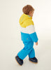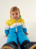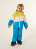 Downfeather effect baby ski suit made of textured fabric, laminated with breathable (20,000) and waterproof (20,000 mm) membrane, with high tear resistance. In addition to the graphene fibre lining, which helps to distribute heat evenly, the centre back, neck and hood are lined with soft fleece, as is the back of the salopettes. Eco-sustainable wadding and salopettes with fully opening zip in sizes 12 and 24 months, for maximum practicality. The ensemble is designed according to the safety standard for children's clothing. The use of recycled wadding and fabric and the eco-sustainable water repellent Teflon EcoElite™ treatment are part of the Colmar Green Path project, aiming to respect the environment as much as possible.