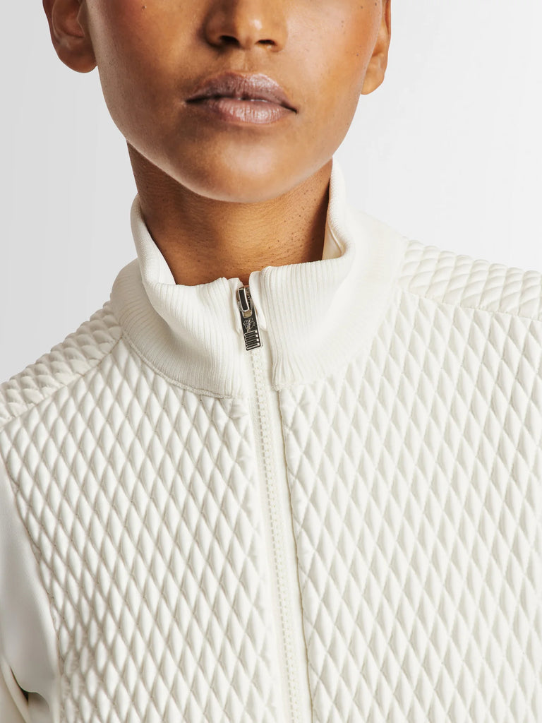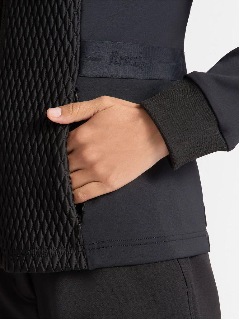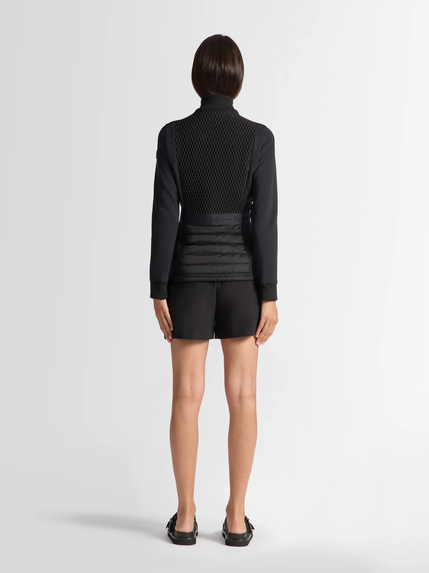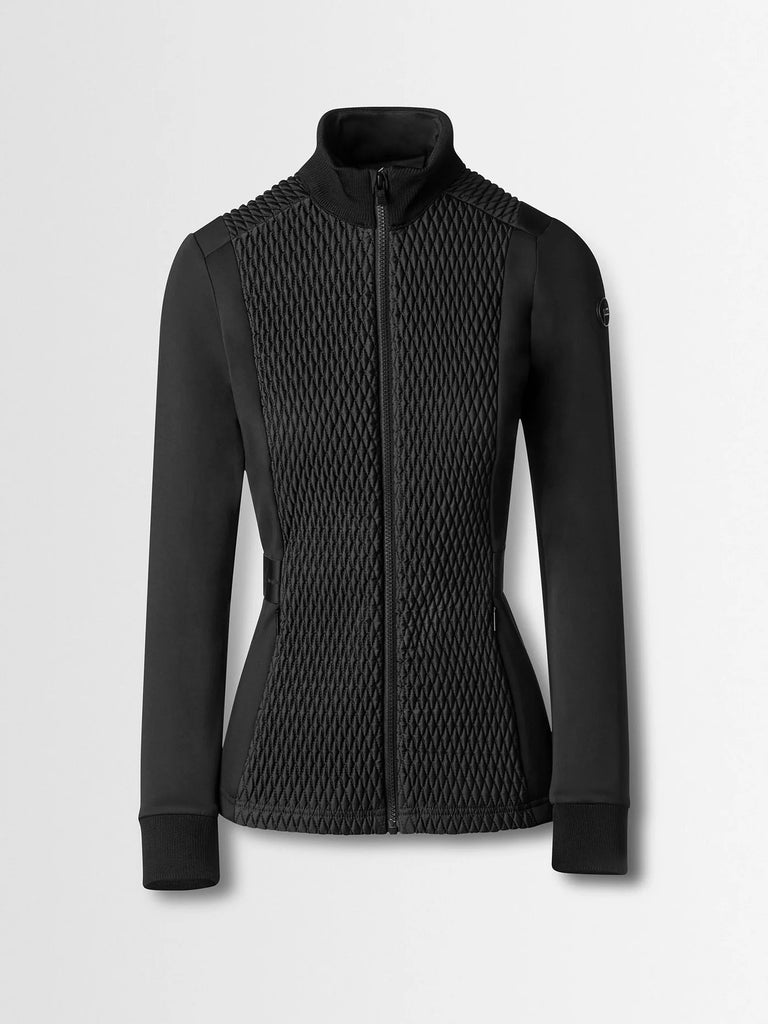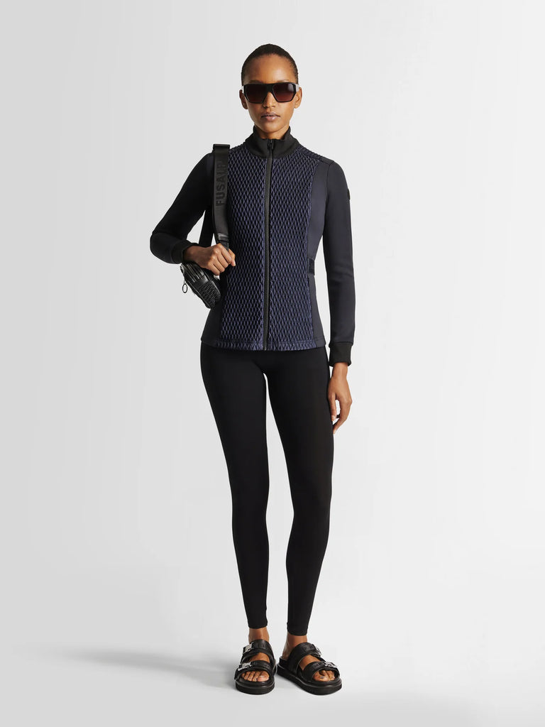 The Meryl lightweight jacket entices with its iconic feel. Made of satiny, water-repellent, Powerstretch nylon and Fusalp's technical neoprene style material, it features the brand's signature smock diamond and a contrasting Fusalp-monogrammed elastic band on the waist for a touch of femininity. The highlight of any outfit, this jacket can be worn on its own during the mid-season or under a coat for a layered look. A glamorous and versatile addition for any wardrobe.