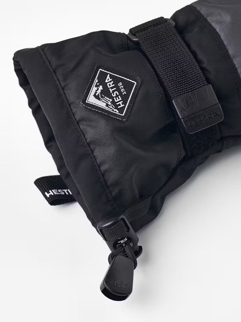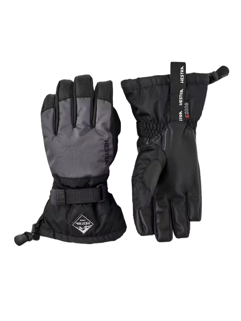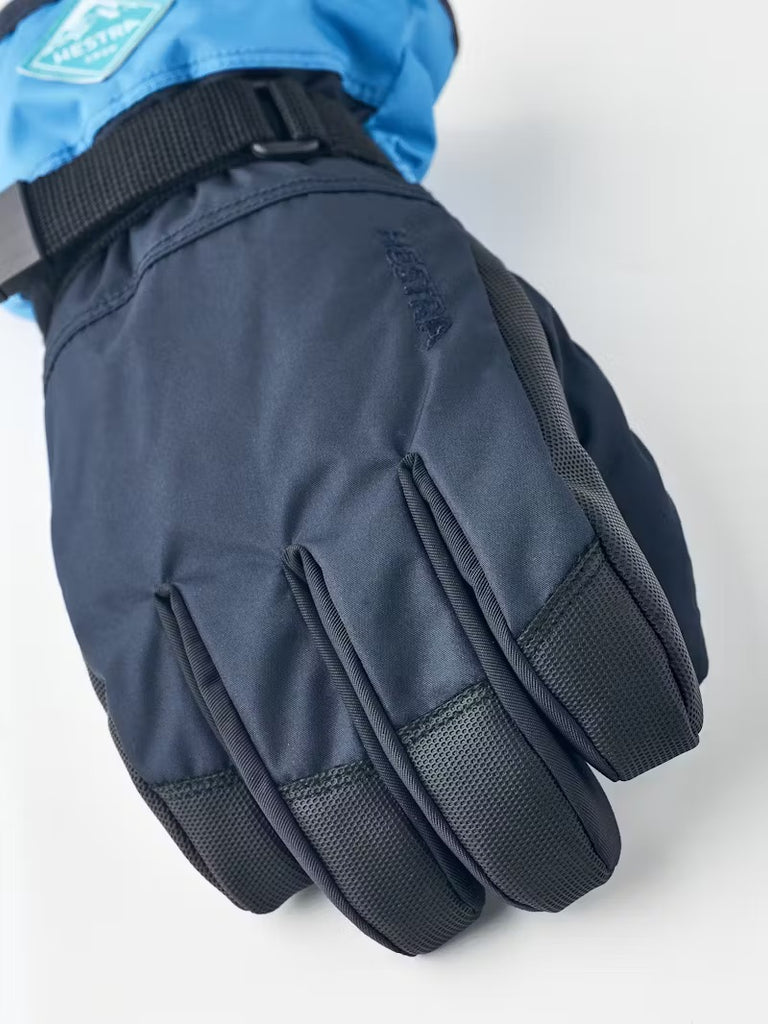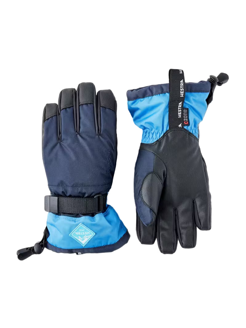 Wind and waterproof winter glove for kids A warm, comfortable kids’ glove for skiing, play and outdoor activities in cold winter weather. One of Hestra’s most popular junior gloves, sewn in hardwearing polyester with a waterproof, breathable CZone membrane and a longer cuff to keep the snow out. Fingertips and palm are reinforced with PU-coated synthetic fabric for extra strength and grip on poles, sledges and other winter gear. The liner is made of polyester fleece with warm synthetic insulation