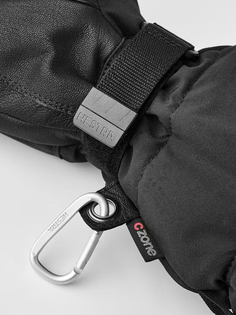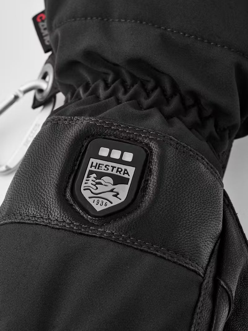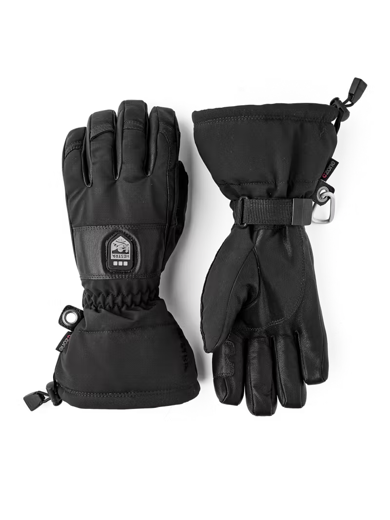 On colder winter days, heated panels on the fingertips help keep your fingers warm.* The heat is adjusted in three steps with an easily accessible control in the Hestra logo on the backhand. Replaceable and rechargeable batteries and a charger are included, as well as Hestra handcuffs (wrist straps) to make sure you don’t drop the glove. Velcro adjustment at inside wrist, and a battery pocket in the cuff.