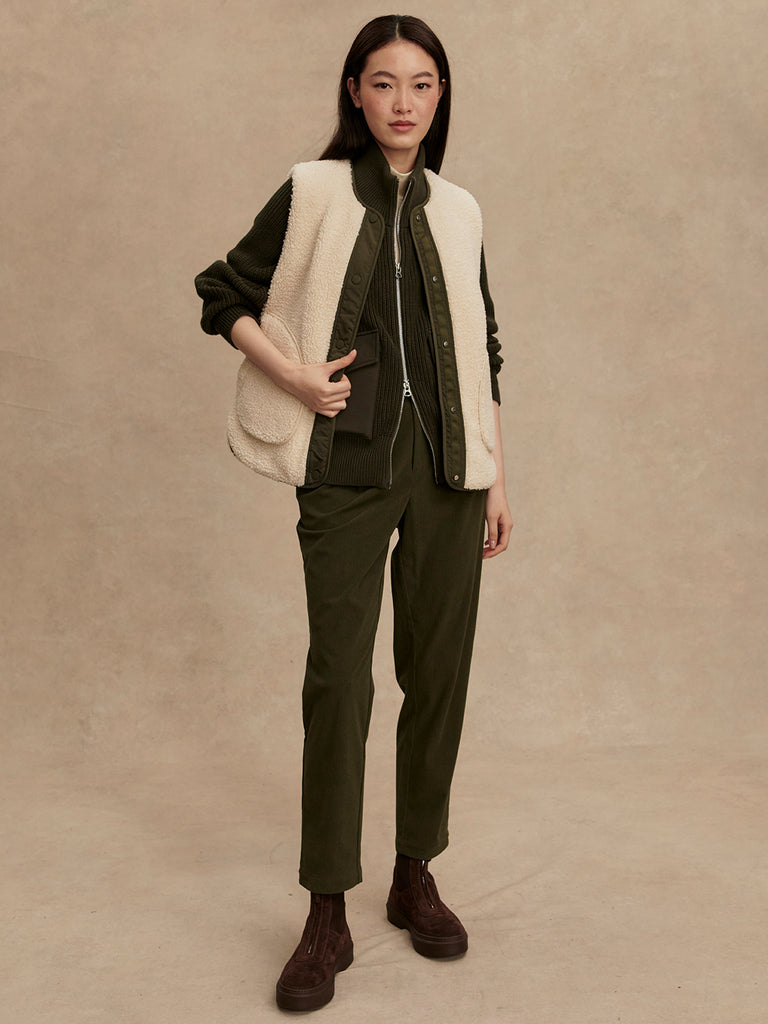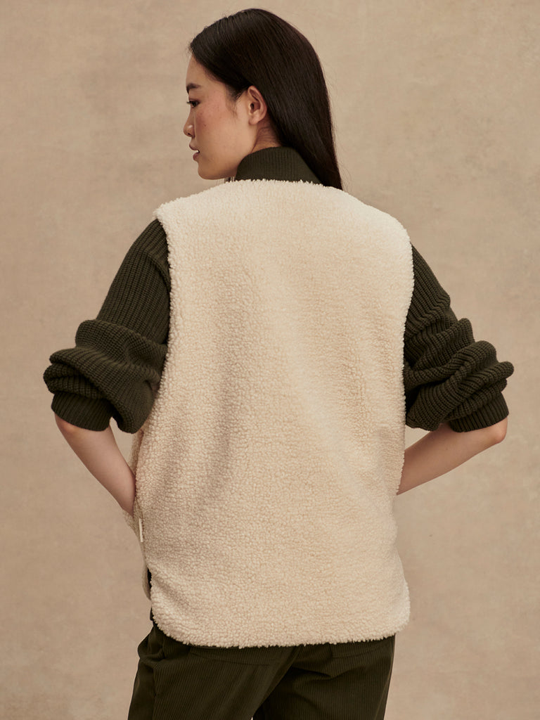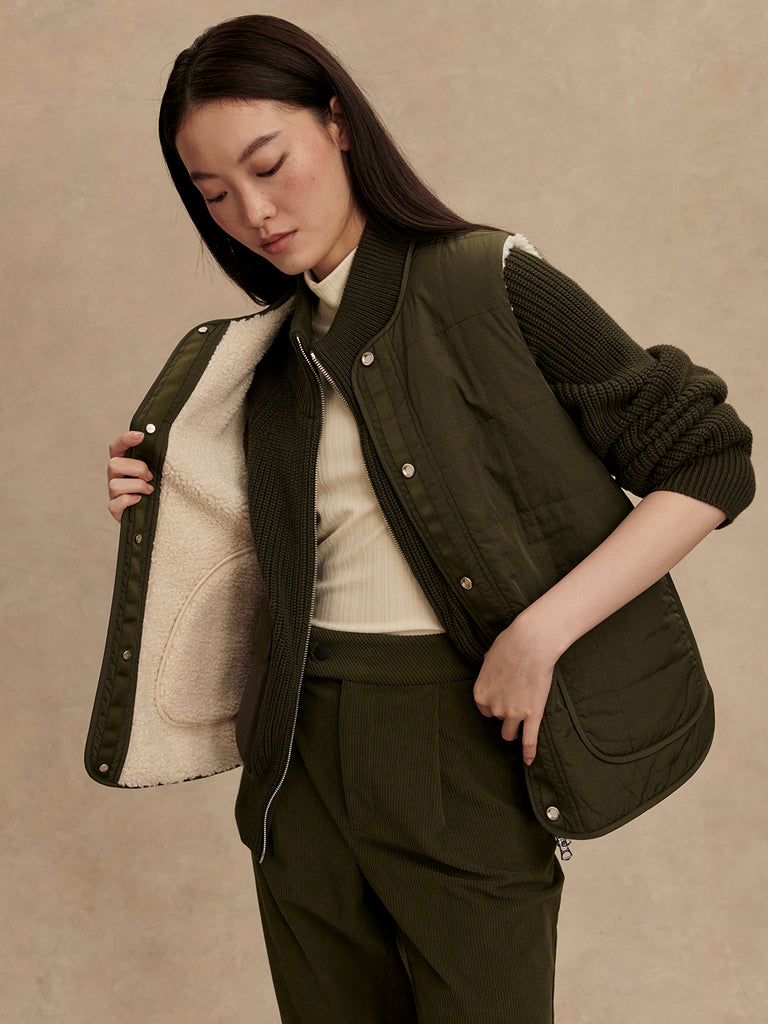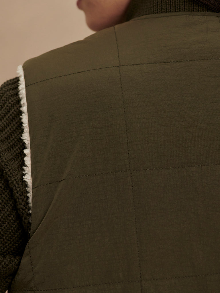 Perfect for wearing over knitwear on colder days, the Audrea gilet is a stylish top layer. It's lightweight and super versatile due to its reversible design, featuring quilted Crinkle Nylon on one side, and sherpa on the other. Complete with functional pockets, an easy button-down front, and contrast color details. A synthetic fill offers ligthweight warmth, perfect for transitional styling.