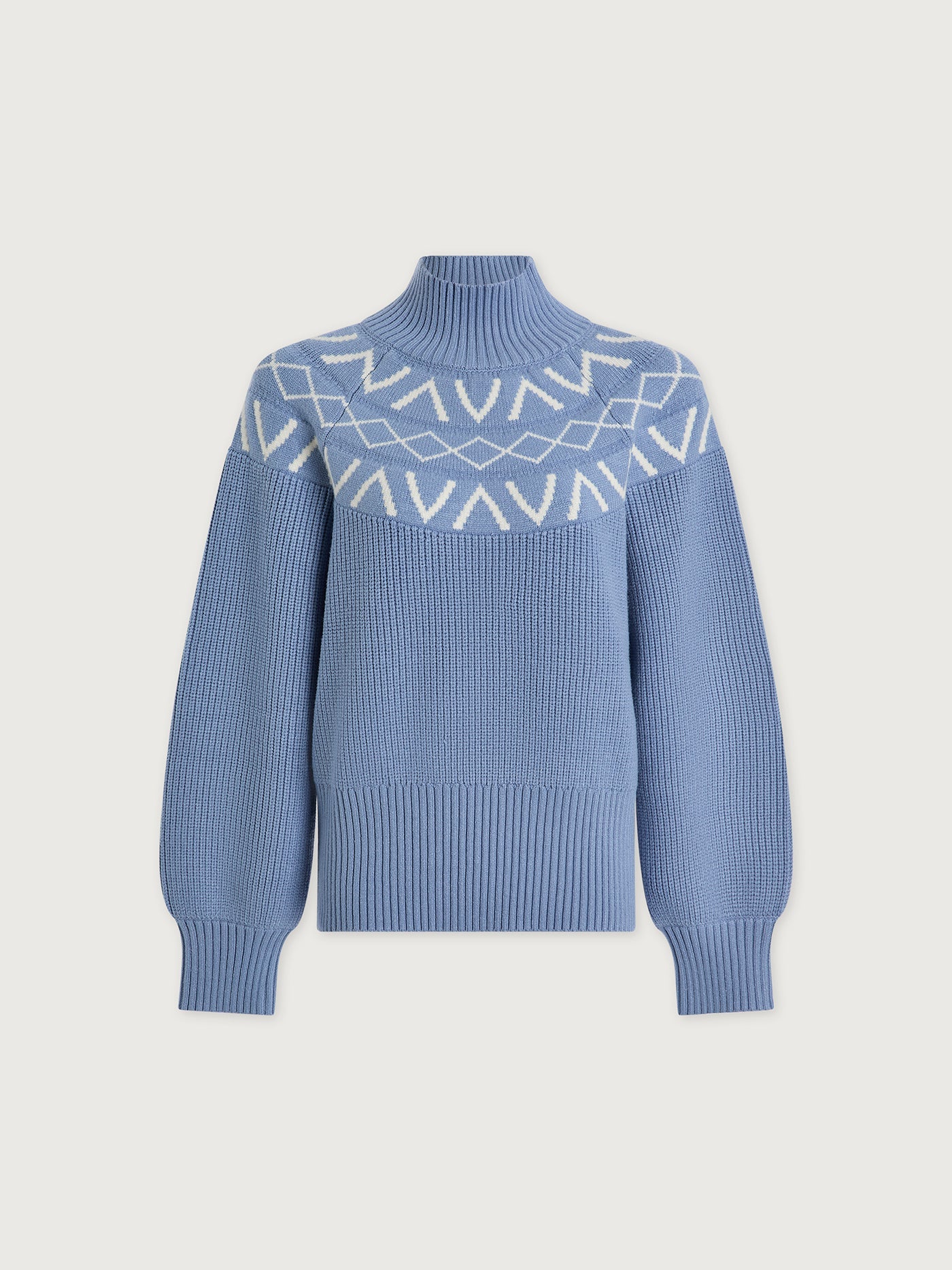 This piece boasts a relaxed fit, turtleneck, and chic balloon sleeves, complemented by an intricate all-over ribbed design and contemporary V monogram Fair Isle yoke. Complete the look by pairing the sweater with our matching beanie for an effortlessly stylish ensemble.