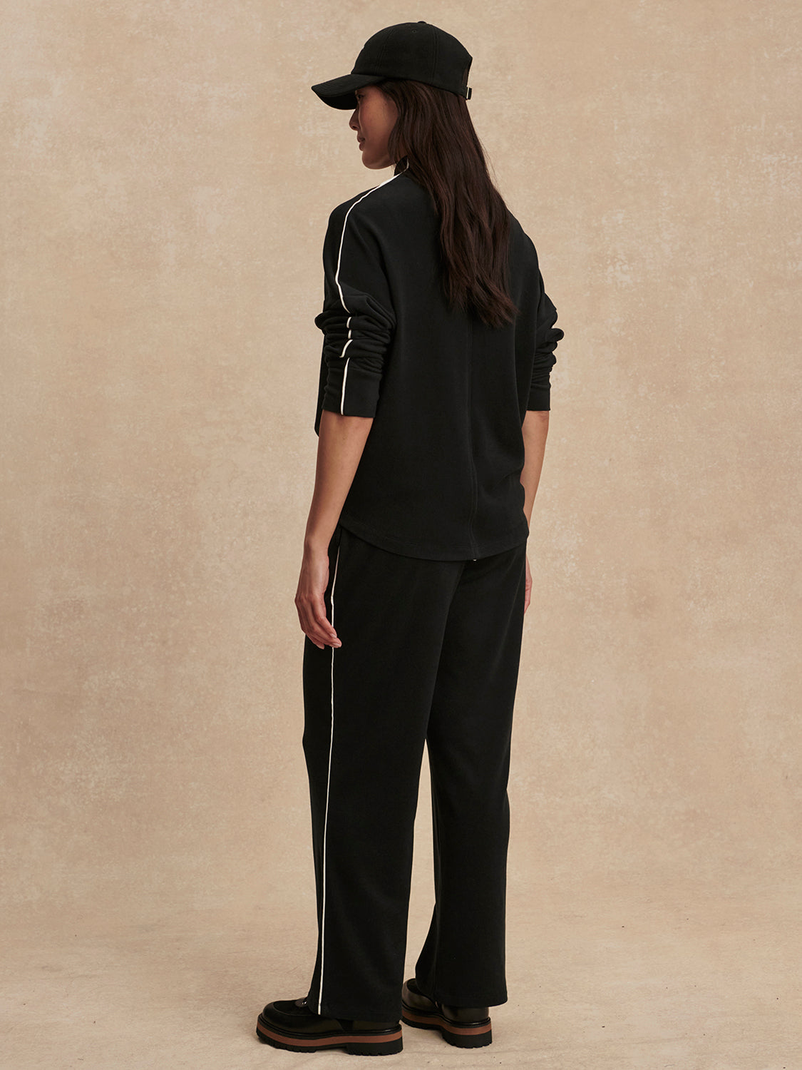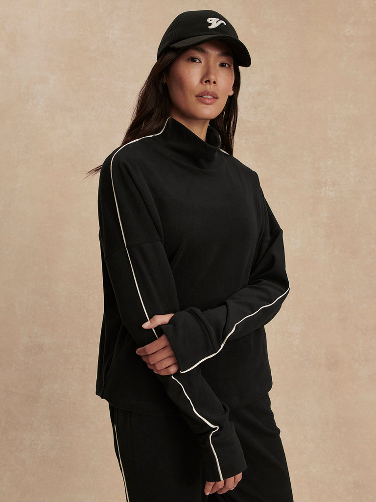 Designed for stylish comfort around your workouts, the Rona active sweat is crafted from our Brushed Rib fabric and elevated with a contrast stripe from the neck to the cuff. The Rona's easy, boxy fit, practical thumbholes, and high neck make it perfect for layering on active days. Finished with a backseam detail, it's made to match the Brushed Rib Straight Leg Pant.